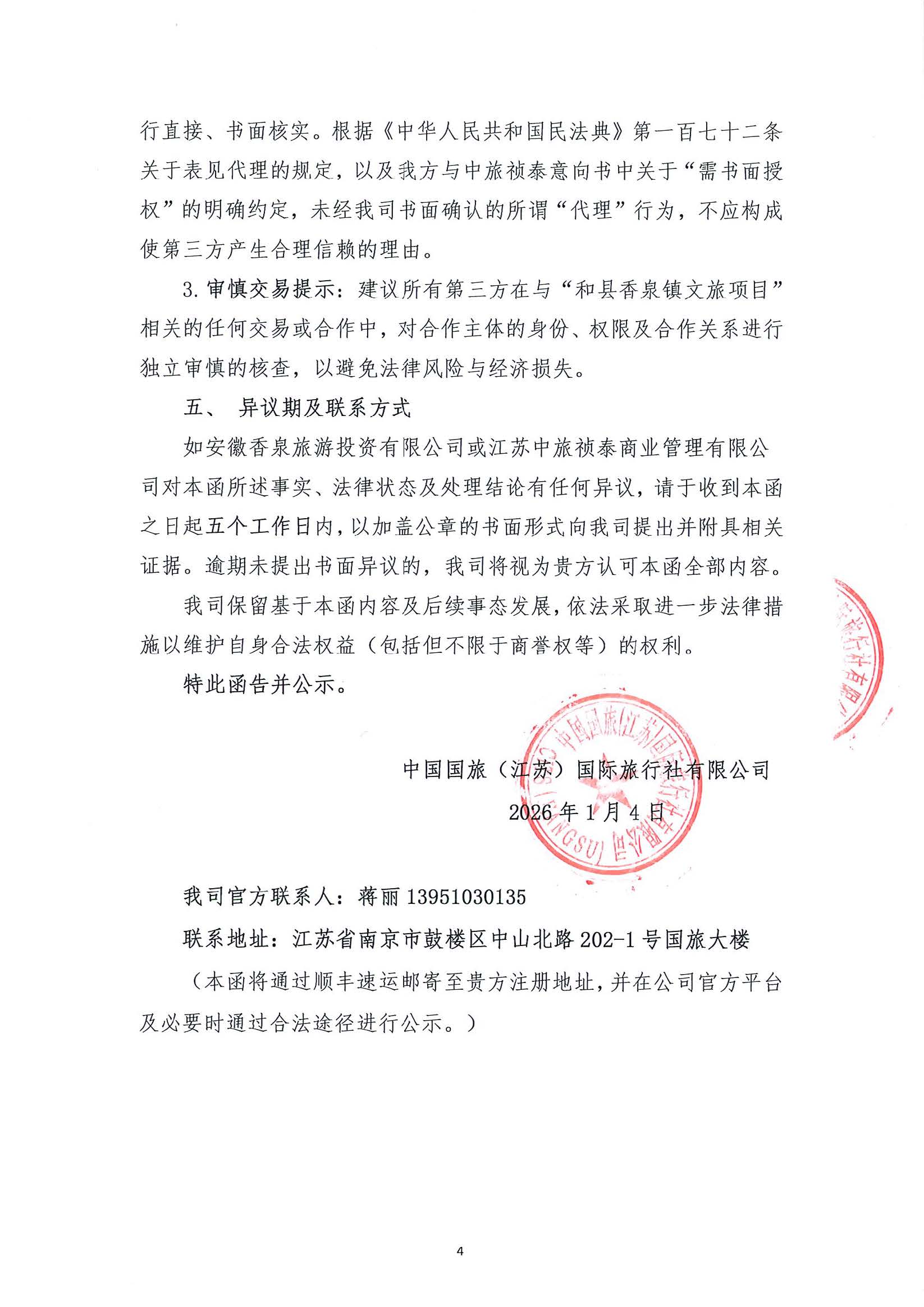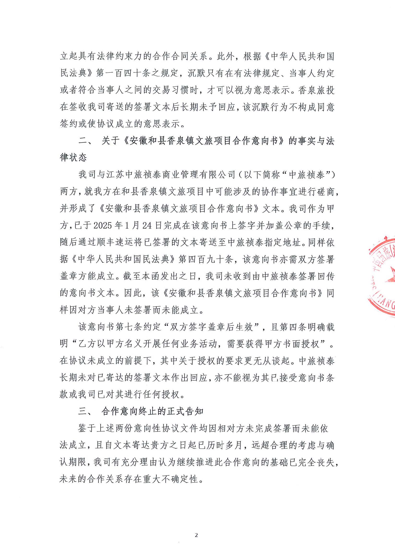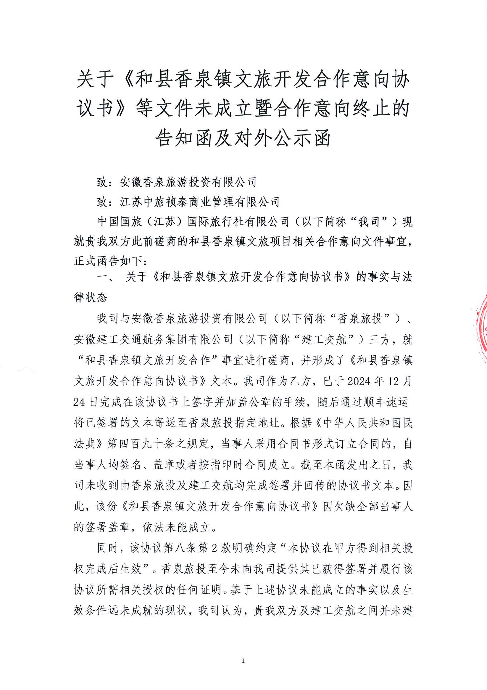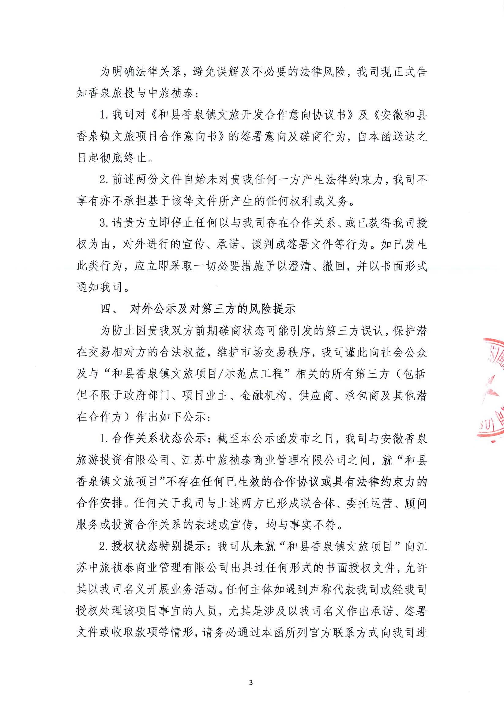 关于《和县香泉镇文旅开发合作意向协议书》等文件未成立暨合作意向终止的告知函及对外公示函